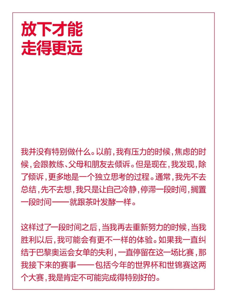 当时,我问自己最多的问题是,我到底能不能接受自己的再次失败?然后,才是说,有没有勇气继续打下一届奥运会。当你接受了,你才可以去展望接下来的路程。如果说,我还一直停留在失利的过程中,我是看不到今天的,也看不到接下来洛杉矶周期的我。