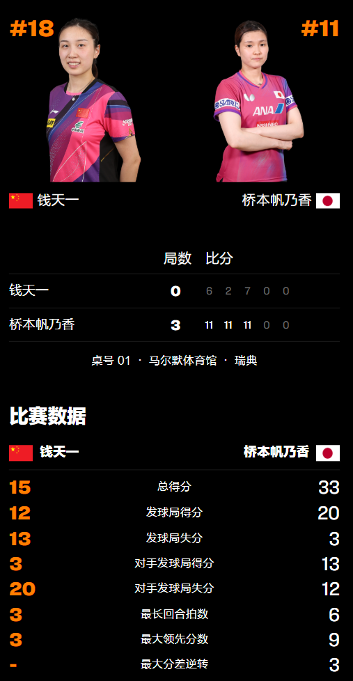 第三局背水一战的钱天一开始增加回球的质量,很快便在开局阶段连得2分但紧接着又连输2球,随后5-2领先再次取得优势但后继乏力,很快便6-10落后挽救1个赛点,最终以7-11结束整场比赛,桥本帆乃香由此而大获全胜晋级女单16强。